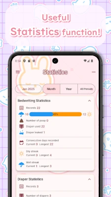 Su šia programėle galėsite itin detaliai sekti lovos šlapinimosi atvejus, fiksuoti sunaudotų sauskelnių skaičių bei stebėti dėvimų sauskelnių rodiklius. Kad duomenų įvedimas būtų kuo paprastesnis ir greitesnis, integruota patogaus šablonų funkcija, leidžianti taupyti laiką. Niekada nepamiršite atlikti įrašo – pranešimų sistema laiku primins apie tai. Be to, visus svarbius duomenis lengvai sinchronizuosite su savo įrenginio standartiniu kalendoriumi, užtikrindami, kad visa informacija būtų pasiekiama vienoje vietoje.