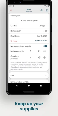 Niekada daugiau nepritrūksite svarbiausių produktų dėka Pantrist atsargų valdymo funkcijos. Nustatykite minimalų pageidaujamą kiekį, ir kai tik atsargos sumažės, prekė automatiškai atsiras Jūsų pirkinių sąraše. Be to, Pantrist padeda kovoti su maisto švaistymu leisdamas tiksliai sekti kiekvienos prekės galiojimo datą, net jei turite kelis tos pačios rūšies produktus su skirtingais terminais. Prekes pridėti itin paprasta: naudokite brūkšninio kodo skenerį su milijonine „Open Food Facts" duomenų baze arba tiesiog įveskite balsu. Mėgaukitės ir galimybe valdyti savo sąrašus balsu, pasitelkus Alexa integraciją.