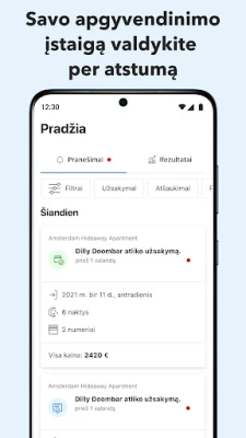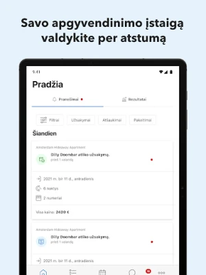 Kiekviena diena su šia programėle tampa aiškesnė ir lengviau valdoma. Jums nereikės spėlioti – iškart matysite šiandienos atvykstančius ir išvykstančius svečius, naujai patvirtintus užsakymus, atšaukimus ar pakeitimus, taip pat naujausius atsiliepimus. Be to, bendravimas su svečiais dar niekada nebuvo toks paprastas: užmegzkite tiesioginį ryšį realiuoju laiku. Sutaupykite brangaus laiko naudodami iš anksto paruoštus, išverstus atsakymų šablonus, skirtus greitai ir profesionaliai reaguoti į dažniausius užklausimus.