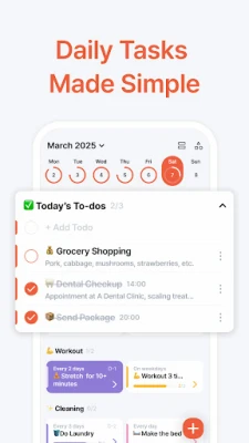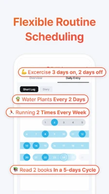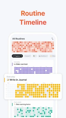 Routineday perkelia įpročių kūrimą į naują lygį, siūlydama neprilygstamą lankstumą. Pamirškite griežtas kasdienes rutinas – čia galite nustatyti pasikartojimo ciklus, atitinkančius jūsų gyvenimo būdą: ar tai būtų trys treniruotės per savaitę, savaitgalio tikslai, ar kas antras mėnuo kartojami įvykiai. Lengvai stebėkite kasdienes rutinas ir vienkartinius darbus, kuriuos programa automatiškai rūšiuoja ir rodo tik tas užduotis, kurios yra svarbios šiandien. Nepabaigtos užduotys sklandžiai perkeliami į rytojų, užtikrinant, kad svarbūs reikalai niekada nebūtų pamiršti. Nustatykite tikslus (pvz., „išgerti 8 stiklines vandens") ir tiesiog braukite norėdami pažymėti pasiekimą, matydami savo pažangą realiu laiku.