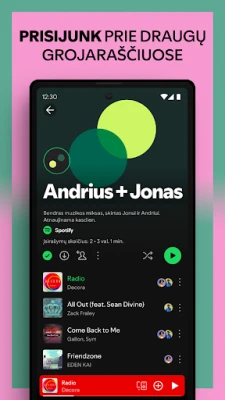 Atraskite ir leiskite milijonus dainų bei populiarių tinklalaidžių su Spotify. Mėgaukitės mėgstama muzika ir garsais iš viso pasaulio, pasiekiamais nemokamai. Išplėskite savo klausymosi patirtį ir atraskite naujų kūrinių be jokių apribojimų.